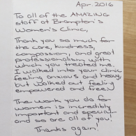 To all the AMAZING staff at Brampton's Women's Clinic,Thank you so much for the care, kindness, compassion, and great professionalism with which you treated me. I walked into your clinic feeling anxious and heavy, but walked out feeling empowered and free.